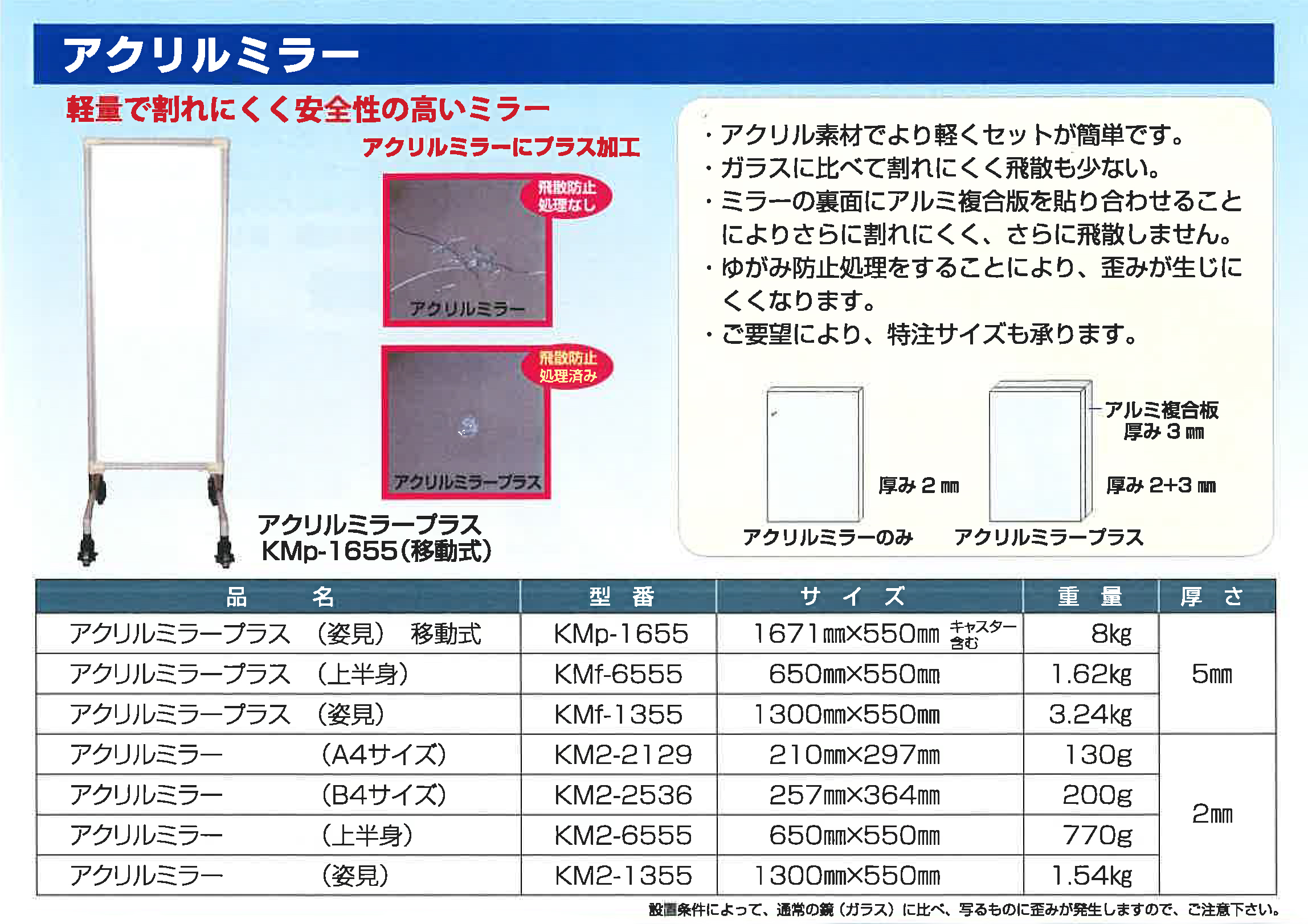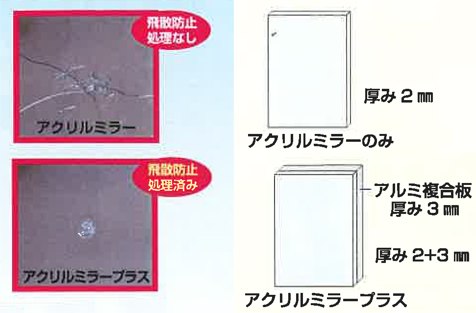 ・ミラーの裏面にアルミ複合版を貼り合わせることによりさらに割れにくく、さらに飛散しません。