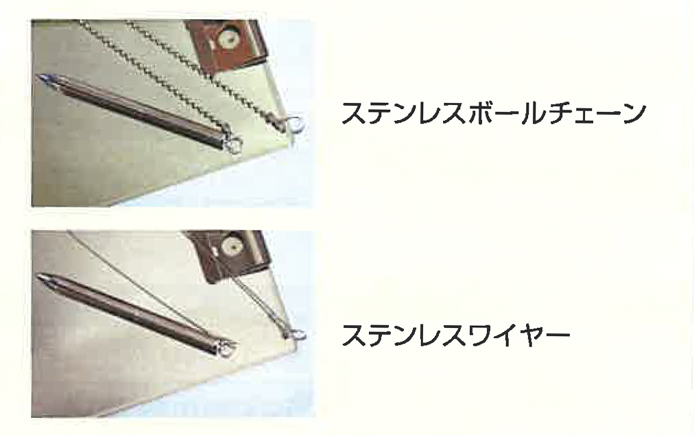 上記画像のようにステンレスボールチェーン又はステンレスワイヤーにてボールペンをセットすることにより、紛失や異物混入を防止します。