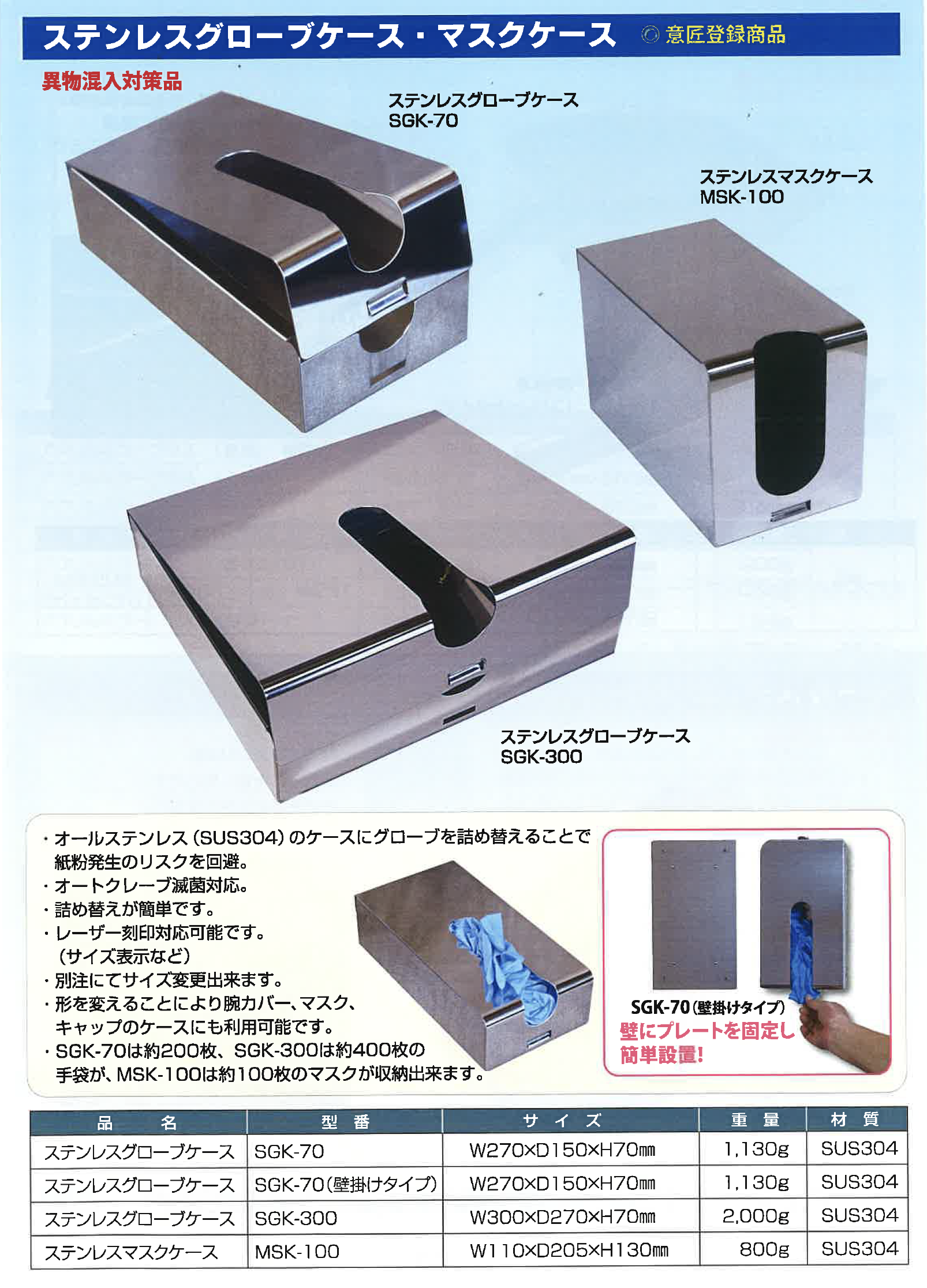 ・オールステンレス(SUS304)のケースにグローブを詰め替えることで紙粉発生のリスクを回避。