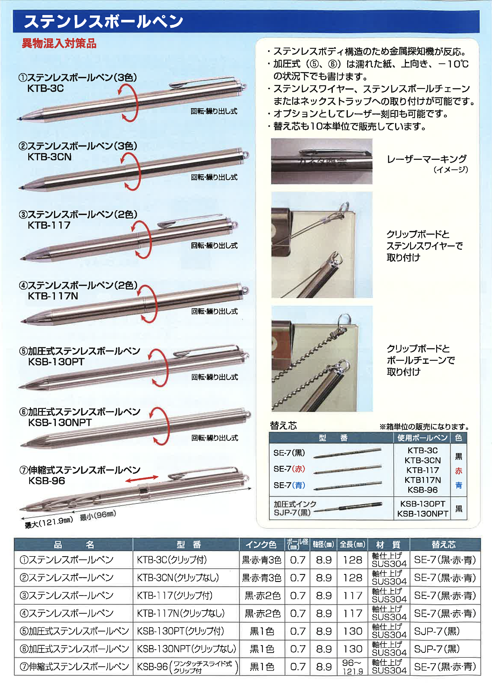 | ① KTB-3C(クリップ付) | 128 | ー | 軸仕上げ SUS304 |