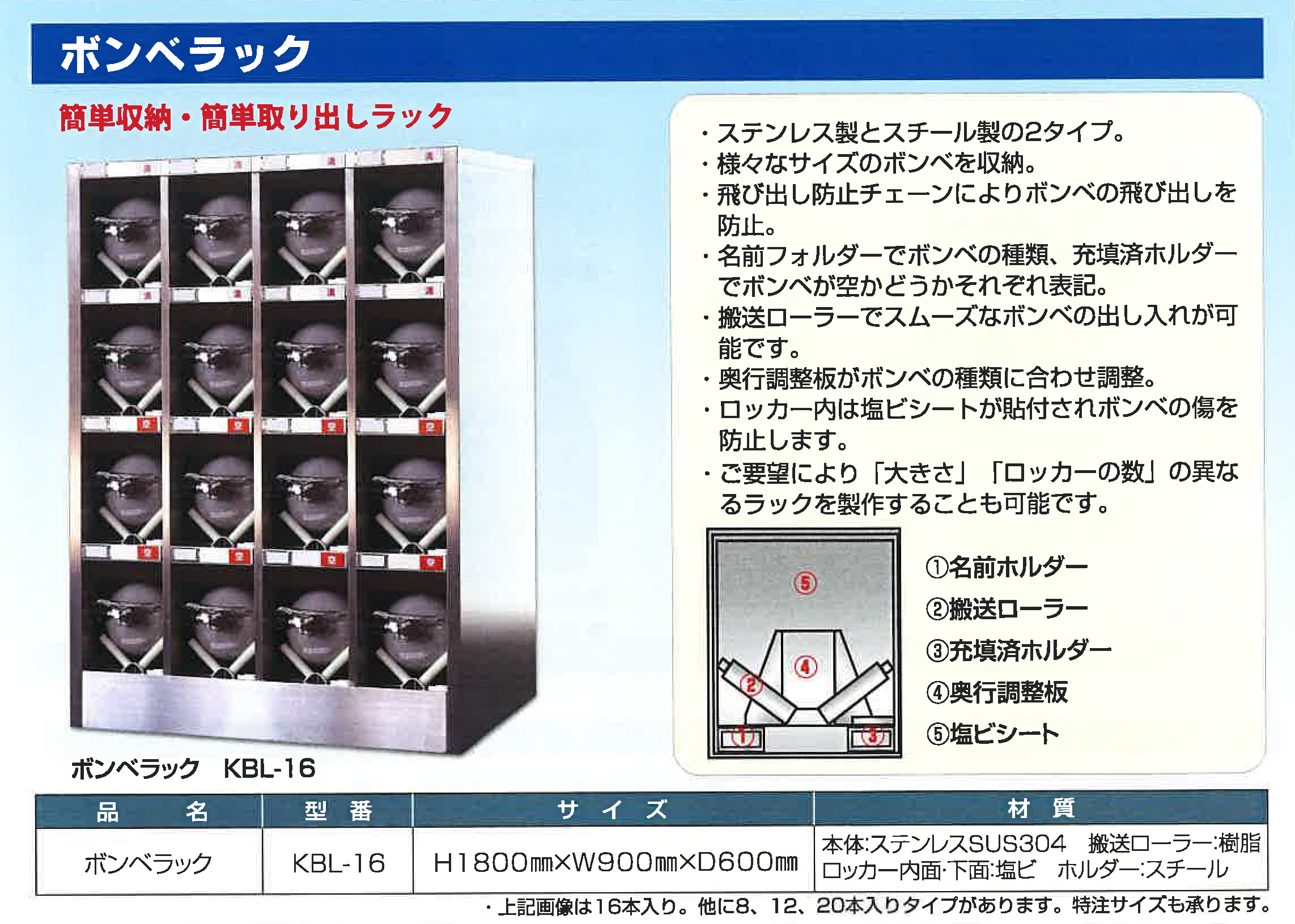 | KBL-16 | H1800×W900×D600 | — | 本体:ステンレスSUS304 / 搬送ローラー:樹脂 / ロッカー内面・下面:塩ビ / ホルダー:スチール |